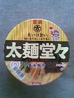 2010-03-07 「太麺堂々 醤油豚骨」(日清食品)=99円 午前、ブロッコリーとアンチョビのスパゲティを作る。カフェラテ、スコーン(+生クリーム、相方メイドチョコクリーム)。午後、紅茶、バタークッキー。日清の太麺堂々醤油豚骨。夜、鶏挽肉と茄子とほうれんそうと人参のカレーを作る。よなよなエール、ポテトチップス。